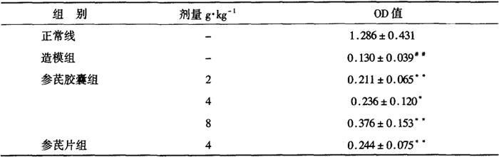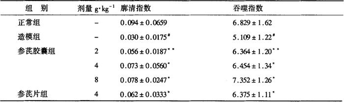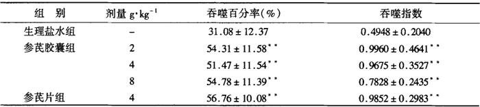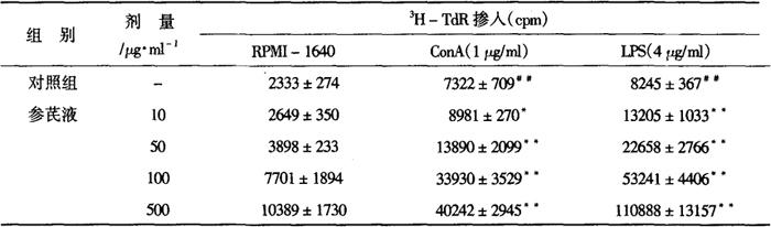 释义 | 人参 黄芪 【中医理论】 黄芪、人参各等份,为末。又名玉屑膏,载于《三因方》(卷九),《兰台轨范》卷五中亦名玉屑散。治尿血并五淋砂石,疼痛不可忍。人参、黄芪均为补气药,人参大补元气,黄芪益气升阳,二药相伍,补元气,生精血,化气行水,淋病日久,气血俱虚者用之,则小便利而淋证除。因黄芪偏于温补固护,人参偏于滋补强壮,是甘温补气的重要配伍,可用于气虚神疲、食少、自汗等身体虚弱诸症。对阴血不足之证,亦可配用。方如补中益气汤。 【药理研究】 1.对小鼠免疫功能的影响 陆氏等[1]针对肿瘤病人经放、化疗后导致的免疫功能低下和骨髓造血功能抑制等不良反应,研究参芪胶囊(由人参、黄芪、当归、熟地黄、鹿角等中药组成)对小鼠免疫功能影响:取参芪胶囊浸膏粉50g,溶解于100ml蒸馏水中,加入95%使其含醇量达到70%,于4℃静置24h,过滤弃沉淀,回收乙醇,经漏斗过滤,以蒸馏水配制成150%溶液,临用前再以RPMI-1640稀释。 1.1 参芪胶囊对小鼠腹腔巨噬细胞吞噬功能的影响 取65只小鼠,随机分成5组,每组13只。分别给予生理盐水、参芪胶囊2、4、8g/kg、参芪片4g/kg,每日灌胃1次,每次每鼠给药容积为15ml/kg,连续7d。每只小鼠腹腔注射5%鸡红细胞生理盐水悬液0.5ml,6h后脱颈椎处死,用油镜观察并计算吞噬百分数和吞噬指数。结果见表12-7-1。 表12-7-1 参芪胶囊对小鼠腹腔巨噬细胞吞噬功能的影响( 与正常组相比:* *P<0.01 由表12-7-1可见,参芪胶囊的3个剂量均可显著增强小鼠腹腔巨噬细胞的吞噬功能,提高巨噬细胞的吞噬百分率和吞噬指数。 1.2 参芪胶囊对小鼠免疫器官重量的影响 将小鼠随机分为正常组、造模组、参芪胶囊3个剂量组、参芪片组,每组10只。每日按0.15ml/10g体重小鼠灌胃给药1次,连续7d,给药d4皮下注射环磷酰胺100mg/kg。各组动物于末次给药后30min,脱颈椎处死,称体重,摘取脾、胸腺,称重。以器官重量(mg)与体重(g)的比值为指标。 表12-7-2 参芪胶囊对小鼠免疫器官的影响( 与正常组相比:# #P<0.05,# #<0.01;与模型组相比,*P<0.05,* *P<0.01 结果表明,参芪胶囊3个剂量均可显著对抗环磷酰胺所致的小鼠脾指数和胸腺指数的下降。 1.3 参芪胶囊对小鼠网状内皮系统的影响 将小鼠随机分为正常组、造模组、参芪胶囊3个剂量组、参芪片组,每组10只。每日按0.15ml/10g灌胃给药1次,连续7d。于给药第4d皮下注射环磷酰胺100mg/kg。各组动物于末次给药30min后,尾静脉注射印度墨汁(用生理盐水按1∶4稀释)0.1ml/10g,于注入墨汁后1、5min分别从眼眶取血20μl,立刻加入2ml0.1%Na2CO3溶液中。以0.1%Na2CO3溶液为对照,于型紫外分光光度计268mm处比色。 动物处死后称体重,并摘取动物的肝脏、脾脏称重。按下式计算K(廓清指数)、α(吞噬指数)。K=(IgOD1-IgOD2)/(t2-t1),α=3K×体重/(肝重+脾重)。 表12-7-3 参芪胶囊对小鼠RES系统吞噬功能的影响( 与模型组相比:#P<0.05,# #P<0.01;与正常组比,*P<0.05,* *P<0.01 结果表明,参芪胶囊的3个剂量均可显著增强小鼠RES系统吞噬能力,可对抗环磷酰胺所致的RES系统吞噬能力的下降。 1.4 参芪胶囊对60Co照射模型小鼠溶血素含量的影响 取小鼠60只,雌雄各半,随机分成6组,每组10只,分组及给药同前。除正常组外,其余组于给药每1d进行60Co照射(3.5Gy,150伦琴/min),给药后的第2d所有小鼠每只腹腔注射5%CRBC0.5ml进行免疫。连续给药,第7d采血、取血清,用NS稀释血清5倍,取稀释的血清1ml与5%CRBC0.5ml、10%补体0.5ml混合,在37℃恒温水浴1h,0℃终止反应,2000r/min,离心5min,取上清,于分光光度计比色,测OD540nm,以OD值作为判断血清溶血素的指标,比较各组的差异。 表12-7-4 参芪胶囊对60Co模型小鼠溶血素含量的影响(x±s,n=10) 与正常组比绞:# #P<0.01;与模型组比较:*P<0.05,* *P<0.01 结果表明,参芪胶囊对60Co照射所致的小鼠溶血素下降的水平有显著的提高作用。 1.5 参芪胶囊对小鼠淋巴细胞增殖反应的影响 将小鼠断头放血处死,无菌取出脾脏置于盛有RPMI-1640培养液的平皿中,制成脾细胞悬液。将此悬液用RPMI-1640培养液洗涤2次,每次1500r/min,离心5min,用0.6%台盼蓝溶液记数活细胞。然后用含10%小牛血清的RPMI-1640培养液将细胞稀释为1×107/ml,并接种于无菌的96孔培养板中,每孔50μl,分组并加入下列处理因素:空白对照组:加RPMI-1640培养液;参芪组:分别加以终浓度为10、50、100、500μg/ml的参芪液;ConA对照组:加入终浓度为1μg/mlConA;ConA+SQT组:除加入终浓度为1μg/mlConA外,另分别加入以终浓度为10、50、100、500μg/ml的参芪液;LPS对照组:加入终浓度为4μg/ml;LPS+参芪组:除加入终浓度为4μg/mlLPS外,另分别加入终浓度为10、50、100、500μg/ml的参芪液;每剂量组设3复孔,每孔总容积均为200μl。置37℃,5%CO2和95%空气的细胞培养箱中孵育72h。终止培养前6h,每孔加人3H-TdR0.5μCi。用多头细胞收集器将各孔之细胞吸于49型玻璃纤维滤膜上,蒸馏水洗10次,置于80℃烘箱中15min,然后将滤膜放入盛有5mI闪烁液的闪烁瓶中,用液闪仪测定cpm值。结果表明:参芪液不仅在体外可以增强ConA诱导的T淋巴细胞增殖反应和LPS刺激引起的B淋巴细胞增殖反应,而且它本身对脾细胞也具有丝裂原作用。 表12-7-5 参芪液对小鼠淋巴细胞增殖反应的影响( 与对照组比较:*P<0.05,* *P<0.01;与RPIM-1640比较:# #P<0.01 1.6 参芪胶囊对60Co照射小鼠白细胞数及骨髓DNA含量的影响 取小鼠60只,随机分为6组,每组10只。设正常组、造模组、参芪胶囊组低、中、高剂量组(2g/kg、4g/kg、8g/kg),参芪片(4g/kg)组,每鼠给
