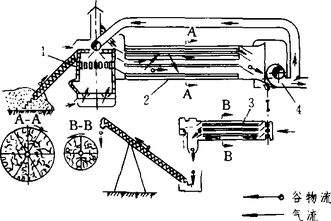 滚筒式烘干机工艺流程图 1.加热炉 2. 滚筒 3. 冷却滚筒 4. 风机 |