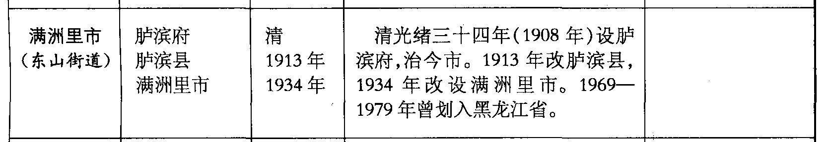 满洲里市(东山街道)胪滨府胪滨县满洲里市清1913年1934年清光绪三十四年(1908年)设胪滨府,治今市。1913年改胪滨县,1934年改设满洲里市。1969—1979年曾划入黑龙江省。