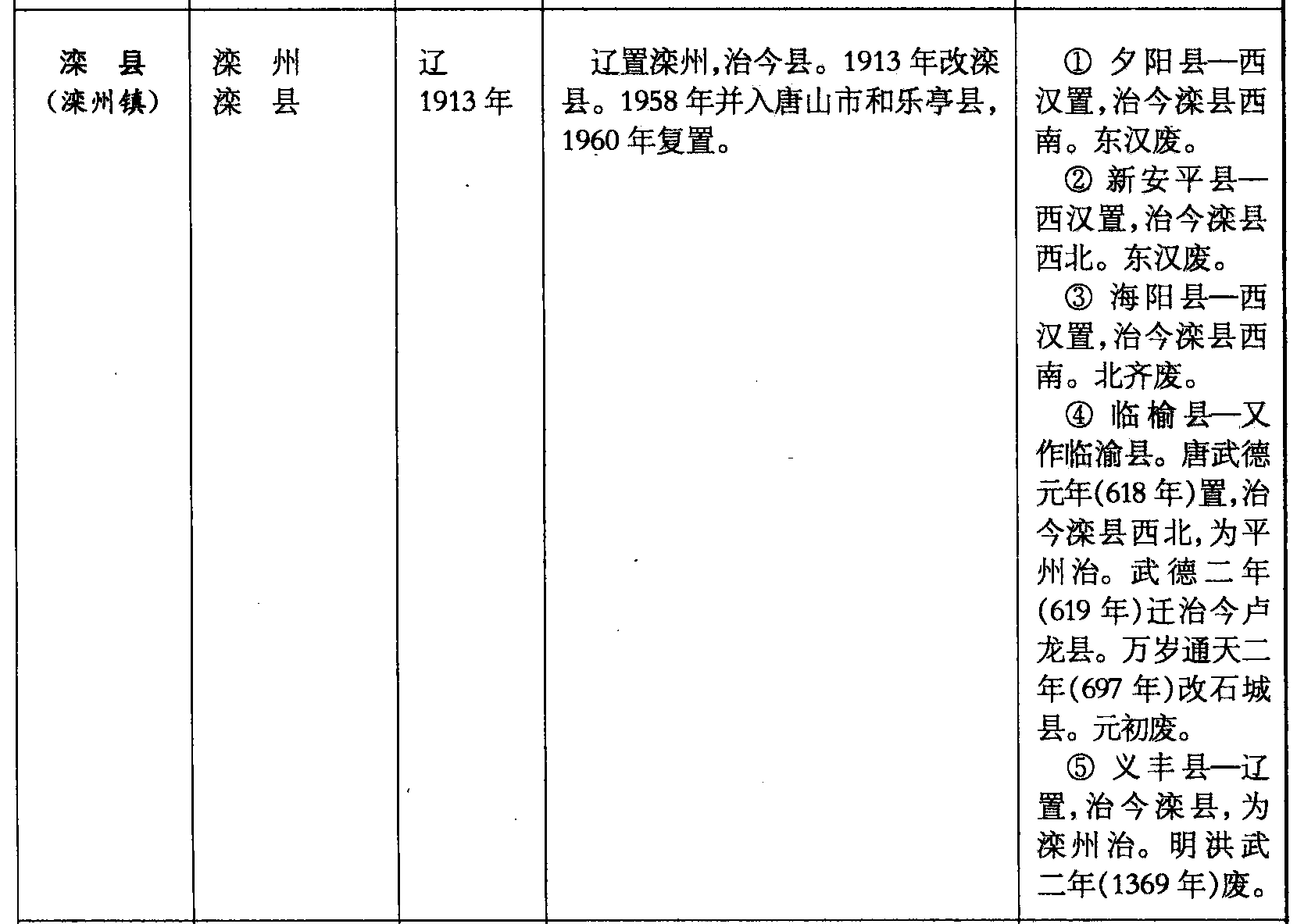滦县(滦州镇)滦州滦县辽1913年辽置滦州,治今县。1913年改滦县。1958年并入唐山市和乐亭县,1960年复置。❶ 夕阳县—西汉置,治今滦县西南。东汉废。❷新安平县—西汉置,治今滦县西北。东汉废。❸ 海阳县—西汉置,治今滦县西南。北齐废。❹ 临榆县—又作临渝县。唐武德元年(618年)置,治今滦县西北,为平州治。武德二年(619年)迁治今卢龙县。万岁通天二年(697年)改石城县。元初废。❺ 义丰县—辽置,治今滦县,为滦州治。明洪武二年(1369年)废。
