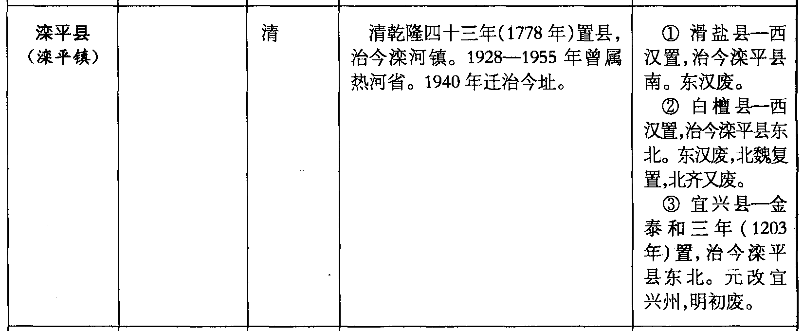 滦平县(滦平镇)清清乾隆四十三年(1778年)置县,治今滦河镇。1928—1955年曾属热河省。1940年迁治今址。❶ 滑盐县—西汉置,治今滦平县南。东汉废。❷ 白檀县—西汉置,治今滦平县东北。东汉废,北魏复置,北齐又废。❸ 宜兴县—金泰和三年(1203年)置,治今滦平县东北。元改宜兴州,明初废。