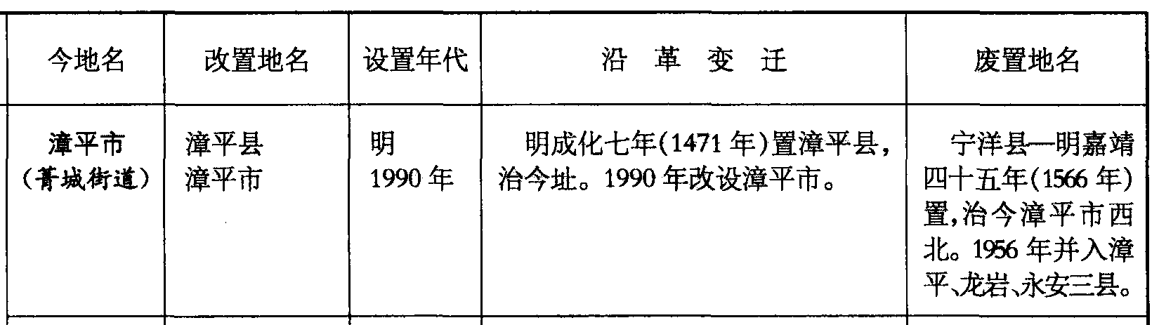 漳平市(菁城街道)漳平县漳平市明1990年明成化七年(1471年)置漳平县,治今址。1990年改设漳平市。宁洋县—明嘉靖四十五年(1566年)置,治今漳平市西北。1956年并入漳平、龙岩、永安三县。