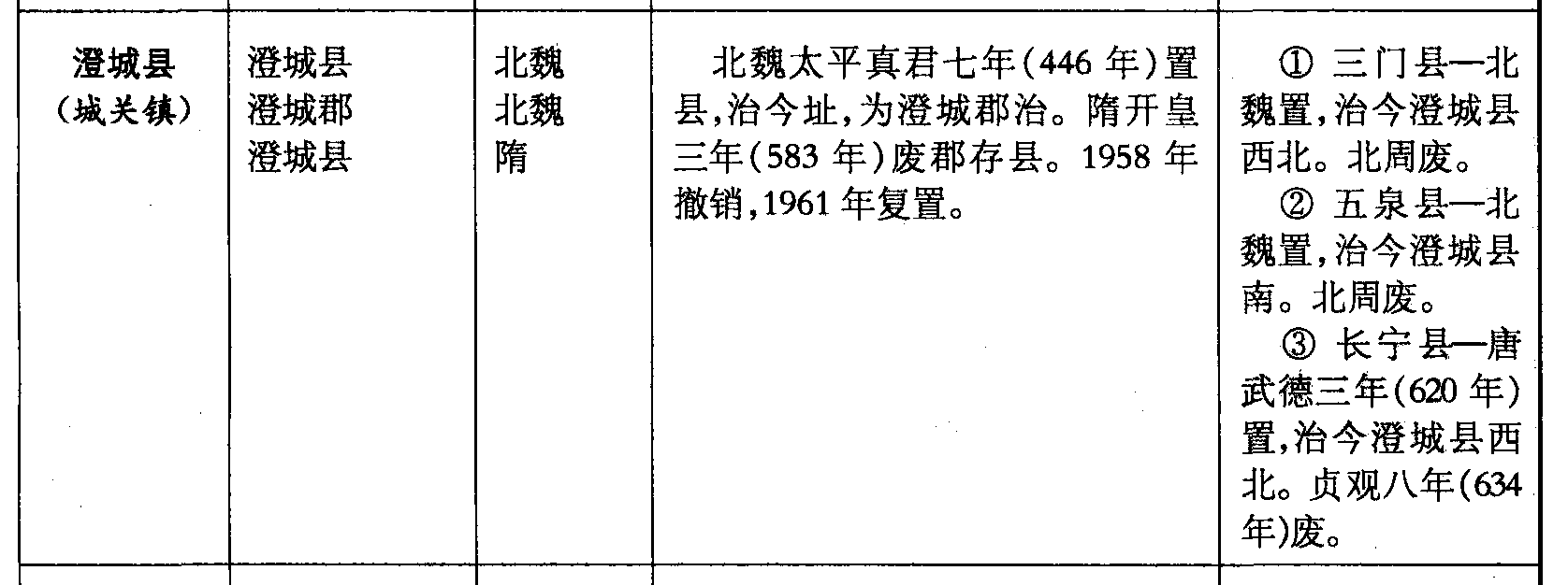 澄城县(城关镇)澄城县澄城郡澄城县北魏北魏隋北魏太平真君七年(446年)置县,治今址,为澄城郡治。隋开皇三年(583年)废郡存县。1958年撤销,1961年复置。❶ 三门县—北魏置,治今澄城县西北。北周废。❷ 五泉县—北魏置,治今澄城县南。北周废。❸ 长宁县—唐武德三年(620年)置,治今澄城县西北。贞观八年(634年)废。