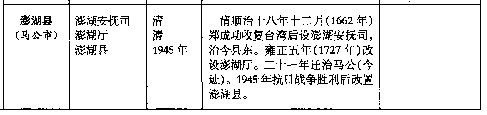 澎湖县(马公市)澎湖安抚司澎湖厅澎湖县清清1945年清顺治十八年十二月(1662年)郑成功收复台湾后设澎湖安抚司,治今县东。雍正五年(1727年)改设澎湖厅。二十一年迁治马公(今址)。1945年抗日战争胜利后改置澎湖县。