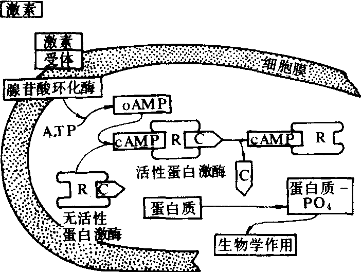 ❸在Mg++存在的条件下,三磷酸腺苷(ATP)转变为环-磷酸腺苷(cAMP),即第二信使。信息由第一信使传递给第二信使。