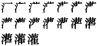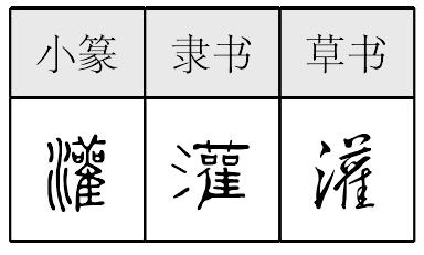 【提示】右上的艹,3画,宋体是一横两竖,楷体第三笔是撇; 旧字形4画。右下的隹,右边第一笔是侧点,旧字形是撇点; 右边有四横,不要错写成三横或圭。 *灌guàn20画 水部 (1) 用水浇地: ~溉|浇~(田地)。 (2) 注入;倒入;装入: 往瓶子里~水|风从窗缝~进来|~肠|~浆|浇~(水泥铸件)。 (3) 录制: ~唱片。 (4)【灌木】 丛生的木本植物。 灌 ☚ 沇 漸 ☛ 灌guàn古代形声字。从氵(水),雚(guàn,猫头鹰一类鸟)声。古用为水名,源出河南商城县,入淮水。假借为浇、灌注义。如:引水灌田|灌一瓶水。组词如:灌注|灌溉(gài)|灌木(主茎不发达,丛生而矮小的树木,如茶树、酸枣树等)。 灌★常◎常