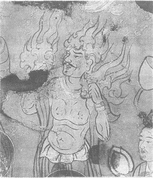 释义 | 火头明王及供养人像壁画 火头明王及供养人像壁画北魏。甘肃省天水市麦积山石窟第78窟壁画。画面上火头明王佩项圈、戴手镯,浓眉、大眼、高鼻、八字须、上身裸体,露出块块肌肉,下围长裙。双手握拳,举至肩部。臂缠飘带,双臂粗壮,其头上及双肩烈火熊熊。运笔粗犷,婉转多变,以显示其刚劲,有力。图的右下角为一男供养人,头戴花冠,脸形椭圆,相貌清秀,举莲蒂一枝。其形象文质彬彬,神态虔诚无比。面敷粉白,与黑色胡须和朱唇反差强列。图中的两个人物外形乃至气质都有鲜明的对比。专家认为,通过这幅图可说明甘肃东部的早期石窟艺术要比河西一带更具民族传统绘画的特色。此图为本世纪70年代清理而出,色彩浓厚,鲜艳如新。 ☚ 供养人像壁画 伎乐天图壁画 ☛ |