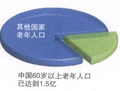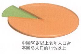 2005年全国1%人口抽样调查显示,全国人口中,0~14岁的人口为2.65亿人,占总人口的20.27%;15~59岁的人口为8.97亿人,占总人口的68.70%;60岁及以上的人口为1.44亿人,占总人口的11.03%(其中,65岁及以上的人口为1.0045亿人,占总人口的7.69%)。 与第五次全国人口普查(2000年)相比,5年来,0~14岁人口的比重下降了2.62个百分点,60岁及以上人口的比重上升了0.76个百分点(其中,65岁及以上人口比重上升了0.73个百分点)。一些专家预计,今后50年,老年人口还将以年均3.2%的速度递增。 到2040年,中国60岁及以上老人将达到约4亿人,占总人口的约26%,平均不到4人就有1位老人,在大城市中大约每2~3人就有1位老人。 中国60岁以上老年人口占世界老年人口总数的五分之一左右  中国的老年人口  |