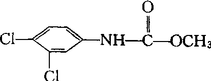 氨基甲酸酯类内吸、选择性除草剂。化学名称:甲基-N-(3,4-二氯苯基)氨基甲酸甲酯。化学结构式如下。纯品为白色结晶,熔点112~114℃,不溶于水、煤油和氯仿,易溶于二甲基甲酰胺、丙酮、二-异丁酮等有机溶剂。性质较稳定,在碱性介质中易分解。可被幼芽吸收,抑制细胞的有丝分裂,干扰植物体内的代谢过程。药效较慢,水稻、马铃薯等有较强耐药力。主要用于水稻田防除稗草、牛毛草、三棱草等。对大鼠急性口服LD50为552 mg/kg,兔急性经皮LD50>2 480 mg/kg。