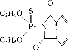 灭菌磷ditalimfos有机磷杀菌剂。化学名称:O'O二乙基邻苯-甲酰亚胺硫代磷酸酯。化学结构式如下。原药为白色结晶,水中溶解度133 mg/kg(室温)溶于正己烷、环己烷、乙醇、苯、四氯化碳、乙酸乙酯及二甲苯。常温下稳定,碱性条件下高于熔点(83~84℃)不稳定。耐紫外光分解。1966年由美国道化学公司推广。保护性杀菌剂。叶面喷洒用于防治苹果白粉病、黑星病。大鼠急性口服LD50为5 660 mg/kg、每天以51 mg/kg剂量饲喂大鼠,连续102天,未见中毒病状。对植物安全,有时出现轻度药害。