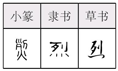 liè形声,从火,列声,本义为火势猛烈,引申为强烈、严厉、刚直不屈服、光明显赫、功业等。烈士,重义轻生的有气节的人,引申为为正义事业而牺牲的人。 |