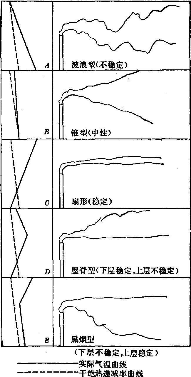 不同高度的大气层因受热强度不同形成一定的密度差,从而引起热量与动量的流动,使大气湍流增强。由于大气压力随高度降低,在绝热状态 (不与外界发生热交换)下,上升空气团的体积将膨胀,其温度也随之下降。干空气与未饱和的湿空气的绝热递减率γd约为1℃/100m,即每上升100m时温度降低1℃。由于日照的昼夜变化、地面的冷热辐射、地形及冷暖气流运动等因素的影响,大气温度的实际垂直递减率γ可能大于、等于或小于γd。γ<γd称为超绝热递减; γ>γd称为亚绝热递减。若气温随高度升高而升高则称为温度逆增 (气温逆增),简称逆温。当γ<γd时,作绝热膨胀的上升气团总是处于比它密度大的空气中,因而受到向上作加速运动的浮升力作用; 作绝热压缩的下降气团总是进入比它的密度小的空气中,因而受到向下作加速运动的沉降力作用。在这种情况下,大气处于热不稳定状态,垂直混合强烈,湍流强度大,大气的扩散稀释能力强。反之,在亚绝热递减状态下(尤其是出现逆温时),γ>γd,作绝热膨胀的上升气团总是进入比它密度小的空气中,沉降力将力图使它回到原来的位置; 作绝热压缩的下沉气团将进入比它的密度大的空气中,浮升力将力图使它回到原来的位置。这时大气处于热稳定状态。垂直混合受到压抑,湍流强度小,大气的扩散稀释能力弱。当γ=γd时,上升与下降气团都处于与它本身的密度相同的空气介质中,既未受到继续向上运动所需的浮升力,又未受到继续向下运动所需的沉降力,气团处于随遇平衡状态。大气的湍流强度与扩散稀释能力均处于前述两种状态之间,大气处于中性状态。 随着大气层垂直温度结构的变化,从一烟囱或排气筒排出的烟气在大气中的扩散有如下几种主要类型。 图2-A为大气的实际递减率γ小于干绝热递减率γd的不稳定状态下的情况。由于大气的垂直混合强烈,烟气扩散速度快。最大地面浓度点至污染源的距离近,污染物落地浓度较高,但浓度随距离衰减较快。这一情况多见于日照强度较大的晴天的中午。 图2 烟气在大气中扩散稀释的几种类型 图2-B为γ接近于γd的近中性状态下的情况。烟气流呈锥形。大气的湍流强度,烟气扩散速度与相应的落地浓度都较前一类型低。这一情况多见于日照强度较低的阴天或多云的白昼及风速较大的夜间。 图2-C为温度逆增时的情况,此时大气的垂直混合受到压抑,烟流只能在水平方向扩展,呈扇形。污染物的扩散速度较慢,污染源附近地面浓度较低。但由于扩散稀释缓慢,污染物在大气中聚积。故在这种情况易形成较大的污染。 图2-D为烟流水平轴线上方不稳定而其下方有温度逆增的情况,在这种情况下,烟流向下的扩散受阻但可向上扩散,因此地面大气中污染物浓度较低。这一情况多出现于日落后近地层出现接地逆温,但尚未影响到高层大气或高层大气受冷气流影响的情况。 图2-E为烟流轴线上方为逆温而其下方的垂直递减率大于γd的情况。此时,由于存在逆温,烟流向上扩散受到限制,但可以向下扩散。故污染源附近地面浓度较高,可形成较严重的污染。这种情况一般在夜间有强逆温层后的次日出现。白天地面受到日照后温度升高较快,逆温层自下而上开始破裂,出现下层不稳定而上层稳定的情况。 ☚ 静电除尘器 烟囱和排气筒高度的确定 ☛ |