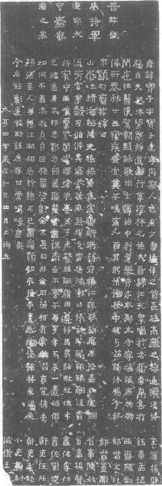 释义 | 爨宝子碑 爨宝子碑东晋碑刻。即《晋故振威将军建宁太守爨宝子墓碑》。大亨四年立。碑文记载建宁太守爨宝子事迹,为研究古代边远地区少数民族的重要资料。正书。其书朴质健劲,体在隶楷之间。康有为称: “晋碑如《郛休》、《爨宝子》二碑,朴厚古茂,奇姿百出,与魏碑之《灵庙》、《鞠彦云》,皆在隶、楷之间” (《广艺舟双楫》)。与南朝宋的《爨宝颜碑》并称为“二爨”。著名碑刻之一。清乾隆四十三年于云南南宁(今曲靖)出土,咸丰时移置城中武侯祠。 ☚ 临辟雍颂 爨龙颜碑 ☛ 爨宝子碑 被誉为“南碑瑰宝” 的“二爨碑”是《爨宝子碑》和《爨龙颜碑》的合称。《爨宝子碑》额题《晋故振威将军建宁太守爨府君之碑》,全文13行,388字。碑高183厘米,宽68厘米,因在形制上小于《爨龙颜碑》,故称之为“小爨”。如论立碑时间,还数“小爨”在先。 《爨宝子碑》刻立于东晋安帝义熙元年(405),清乾隆四十三年(1778)在云南曲靖县扬旗田出土。碑末署“大亨四年,岁在乙巳四月上旬立”。据《晋书》和《资治通鉴》所记,大亨年号仅存在几个月。公元402年,岁在壬寅,晋安帝改元元兴。三月,元显讨桓玄失败,又恢复隆安年号。不久,桓玄进京掌权,改年号为大亨。次年十月,桓玄篡位,改元永始,而史籍仍称元兴二年。至乙巳年(405),桓玄早已败亡,安帝又改元义熙了。爨氏集团远处边陲,不知中央频频改元,仍袭用大亨年号,这只能说明爨族与东晋政府的联系松散,并不能用来怀疑《爨宝子碑》的真实性。 该碑的书者作者均无从查考。碑文虽工整典雅,却多陈词滥调。然而,它“朴厚古茂,奇姿百出”,介乎隶楷之间的奇特书体,却使人流连不舍,击节叹赏。 碑中横画有逆入平出用隶法者,如“恸”之上横; 也有落笔收锋用楷法者,如“嗟”之上横。撇画有末尾上曲收锋似隶者,如“休”之下撇;也有用楷法之“掠”者,如“铭”之下撇。捺画有尾部上翘如隶者,如“休”之末笔;也有用楷之磔法者,如“疾”之右下波。竖钩有回锋慢弯如隶者,如“躬”字右钩; 也有用楷之趯法者,如“秋”之左趯。 除用笔兼有隶楷外,《爨宝子碑》的笔画还有自己的独特风格。其最著者,为横画两端多上翘而呈方势,如“所”字; 竖画多带上曲慢弯,如“中”字; 撇捺多有翘尾,如“春”字;点则多呈三角形。这类笔画,在全碑中占有很大的比重。因其势皆向上升举,故而使人阅之,有如百鸟振翎,凌空欲飞。 《爨宝子碑》的结体向以奇肆见称。如“爨”字体大,“府”字形小。“感”字丰臀,“素”字细腰。“恸” 字矮胖,“伟” 字瘦长。“春”字手长过膝,“质”字足短如截。“鸣” 之 “口” 高高在上,“馨”之“香”宁左勿右。“崩”下左倾,“姿”上右倒。这怪拙的形体,配上奇特的笔画,致使整幅篇章生面别开,风格独具,跌宕起伏,精彩层出,触目皆奇,无字不怪,令人耳目一新,肃然改容。 1965年出土的东晋《王兴之夫妇墓志》、《王闽之墓志》、《王丹虎墓志》,在时间上早于《爨宝子碑》约半个世纪。这批墓志的笔法与《爨宝子碑》相似,但用笔拘谨,结体规矩,在气势魄力上都大为逊色。倒是晚于《爨宝子碑》半个世纪的北魏《中岳嵩高灵庙碑》,在用笔、风格上与“小爨”更为接近,不过在古拙恣肆上似乎还略逊此碑一筹。 康有为《广艺舟双楫》称《爨宝子碑》 “端朴如古佛之容”。李根源则说其“下笔刚健如铁,姿媚如神女。”其实,此碑虽然质朴,但并不乏修饰,其众多的特殊笔画的修饰目的至为明显。该碑的质朴正是用修饰来充分表露的。就好比幼儿稚女,玩娶新娘游戏,少加修饰,憨态可掬,一种天真、活泼、直率、纯朴的情态,就充溢于外了。 爨宝子碑俗称“小爨碑”。东晋时云南碑刻。义熙元年(405)立。碑文叙墓主里籍、身世及官职,从所官的 “振威将军建宁太守”来看,可知是统治当时滇西北、滇中“爨蛮”(即彝族的先民)地区的最高统治者。唯他二十三岁即死, 故无事迹可言。碑高183厘米,广68厘米,碑文共十三行,行三十字,碑额十五字,碑末题名十三行, 行四字。均楷书。清乾隆四十三年(1778)在云南南宁(今曲靖)南七十里扬旗田出土。道光《云南通志》始著录。咸丰二年 (1852) 移置曲靖城内。今存曲靖市第一中学。书法古雅,体在楷隶之间。与刘宋时的 *《爨龙颜碑》合称为“两爨碑”。 爨宝子碑 爨宝子碑全称《晋振威将军建宁太守爨宝子碑》。东晋义熙元年(公元405年)四月刻立。通高183年厘米,宽68厘米,厚21厘米。清乾隆四十三年(公元1778年)云南省曲靖县城南70里的杨旗田出土。咸丰二年(公元1852年)时移入城内诸葛武侯祠。1937年移至曲靖县城第一中学爨碑亭内。半圆首,长方身,额题楷书“晋故振威将军建宁太守爨府君之墓”5行15字。正文计13行,400字,主要记叙爨宝子的家世及其政绩,除题名末行最后一字缺损外,其余均清晰可辨。碑末职官题名,记载了当时建宁太守的属官名称,计有主薄、录事、西曹、都督、省事、书佐、千吏、小吏、威仪等大小官吏13人,从这里既可以看出官吏对权势者的阿谀、依附,也可考查当时地方官吏的设置情况,故其具有一定的史料价值。此碑文字体雄劲古朴,拙中带巧,前人多有称道,如李根源说此碑“下笔刚健如铁,姿媚如神女”,康有为则称其为“朴厚古茂,奇姿百出”。其用笔方折,反映了汉字由隶书向楷书过渡的迹象,是