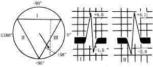 释义 | 爱氏三角法 爱氏三角法Einthoven triangle method是测定QRS波群平均电轴的一种方法。将第Ⅰ和第Ⅲ导联上QRS波群电压之和分别标点在爱氏三角的坐标上(如Ⅰ导联QRS波群代数和是+2.5,Ⅲ导联QRS波群代数和是+2.1),做垂直线彼此相交,此相交点和三角中心相连,即是所求的QRS平均电轴+58°。
