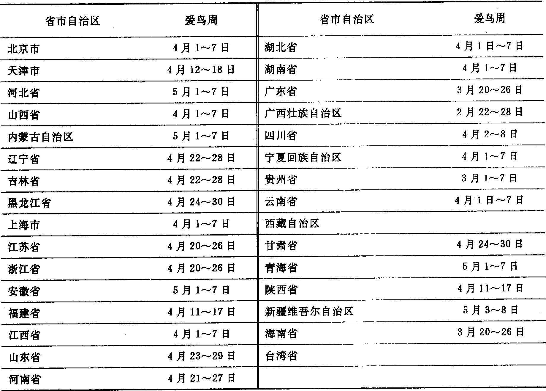 释义 | 爱鸟周àiniǎo zhōu爱护鸟类活动周的简称。1982年国务院决定,每年在全国范围内开展爱护鸟类活动周。北京的爱鸟周是每年的4月1日至7日。例如:“北京市政府即将向市属各单位发出《加强鸟类保护,开展‘爱鸟周’活动的通知》,号召全市人民在今年4月初广泛开展群众性的‘爱鸟周’活动。”(《北京日报》1983.3.6) 爱鸟周 爱鸟周ainiaozhou为了使全国人民对野生动物资源保护的重视,1962年,国务院发出 “积极保护和合理利用野生动物资源”的指示,进一步明确提出野生动物资源是国家的自然财富,要加强资源保护、积极繁殖饲养、合理猎取利用。1981年,国务院再次发出通知,指出“鸟类是大自然的主要组成部分。保护鸟类,对维护自然生态平衡,对科研、教育、文化、经济等方面都具有重要意义。”并同意林业部、外交部、外贸部、财政部、国务院环境保护领导小组、国家城市建设总局、中国科学院和共青团中央8个单位联名提出在每年的4月至5月初的1个星期为“爱鸟周”的建议。现全国各省市自治区,均已根据本地区的具体条件,相继规定出本地区的爱鸟周,并于1982年开始全国性爱鸟周活动。在爱鸟周期间开展多种爱鸟活动。如举办学术报告会、悬挂人工鸟巢、悬挂爱鸟标语、建立爱鸟宣传站、举行爱鸟文艺活动和表扬爱鸟先进个人和单位等。 全国各省市自治区的爱鸟周 ☚ 环志 家禽 ☛ 爱鸟周 爱鸟周ainiaozhou1982年,中华人民共和国国务院批准,每年的4月底至5月初的一个星期,在全国范围内开展“爱鸟周”活动,进行爱护鸟类的宣传和教育。鸟是人类的朋友,是大自然不可缺少的组成部分。爱护益鸟是人类文明的一种表现,也是保护地球上的生物多样性的重要环节。我们大家都要关心、热爱和保护鸟类。 ☚ 植树节 中国 ☛ 爱鸟周 爱鸟周为了促使全国人民对野生鸟类资源保护的重视,1962年,国务院发出“积极保护和合理利用野生动物资源”的指示,进一步明确提出野生动物资源是国家的自然财富,要加强资源保护、积极繁殖饲养、合理猎取利用。1981年,国务院再次发出通知,指出“鸟类是大自然的主要组成部分”。并同意林业部、外交部、外贸部、财政部、国务院环境保护领导小组、国家城市建设总局、中国科学院和共青团中央8个单位联名提出在每年的3月下旬至5月初的1个星期为“爱鸟周”的建议。现全国各省市自治区,均已根据本地区的具体条件,相继规定出本地区的爱鸟周,并于1982年开始全国性爱鸟周活动。老年人应积极选择参加其中力所能及的各项活动。 全国各省市自治区爱鸟周