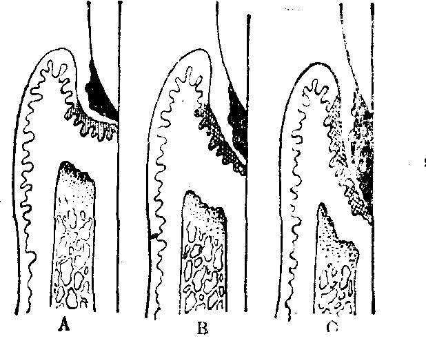 释义 | 牙周袋 牙周袋牙周袋是龈沟的病理性加深,是各种类型牙周病的临床重要症状之一,牙周袋继续发展则可导致牙齿松动或脱落。 牙周袋的形成,是由于局部刺激因素、创伤颌等,引起龈纤维的变性或破坏,结合上皮沿根面增殖的结果。全身因素可以引起牙龈及牙周纤维的变性,因而也可引起牙周袋的形成和加深。 牙周袋 牙周袋虽不算是单独的疾病,但由于血循环障碍,血液滞留。龈纤维及周围组织的破坏,上皮的萎缩水肿和变性的结果,也有相应的临床症状出现。例如牙周袋的龈壁出现各种程度的紫红色改变,松软、光亮表面,及压之成凹等症状。牙龈易于出血是因牙周袋软组织壁中血管增多,加以上皮成溃疡面所致。如果牙周袋较深不易自洁,则可溢脓,或轻压龈壁,袋中则有脓流出。牙周袋的检查,必须查清牙周袋的类型、深浅、形状等特点,这对于诊断各种牙周病,以及应采用相应治疗措施,都有密切的关系。检查牙周袋的方法,须用牙周探针探入牙周袋中以测量从龈缘至袋底的深度。为要了解牙周袋的类型或形状,对牙周袋须进行六点测量,即颊(唇)面、舌面的中点,近中颊(唇)侧点,远中颊(唇)侧点,近中舌侧点,远中舌侧点。如邻面牙已缺失,尚须检查远中面或近中面的牙周袋。在临床上X线检查牙槽骨破坏情况是很必要的,但是必须指出,在X线照片上所显示的牙槽骨损害程度与临床上用牙周探针探测牙周袋的深度和破坏情况不一定完全一致,这是因为牙槽骨的吸收和结合上皮根向移位不是同时进行的,常常是牙槽骨吸收、牙周纤维破坏之后,结合上皮根向移位才形成牙周袋。如有需要可将牙胶尖插入牙周袋中再进行X线照片,这样可比较准确地证实牙周袋深度。 ☚ 牙龈出血 牙周炎 ☛ 牙周袋 牙周袋periodontal pocket又称“真性牙周袋”。是牙周炎的特殊表现。用带有刻度的探针,沿根面向龈沟内深入,探测患牙各面,如牙龈无增生肥厚而龈沟向根尖方向发展,其深度超过2mm,即为牙周袋。袋底位于牙槽嵴之上为骨上袋,袋底位于牙槽嵴之下,为骨下袋(骨内袋)。骨上袋见于牙周炎,其特征是浅而宽。骨下袋见于咬合创伤,其特征是窄而深。因骨下袋发生在牙齿的受压侧,因而对调整咬合提供了依据。 ☚ 牙周溢脓 真性牙周袋 ☛ |