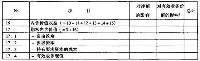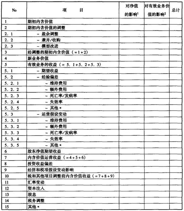 释义 | 人身保险内含价值报告编制指引附则 七十二、本指引由中国保监会负责解释和修订。 七十三、本指引自2006年1月1日起施行。 附件 内含价值分析 公司:__ 期限:从__到__ 1对净值的影响,是指对公司自由盈余和要求资本的影响; 2对有效业务价值的影响,是指在考虑了资本成本以后,对公司有效业务的现值的影响; *保险公司应当对表中所有“其他”项做出解释。 |