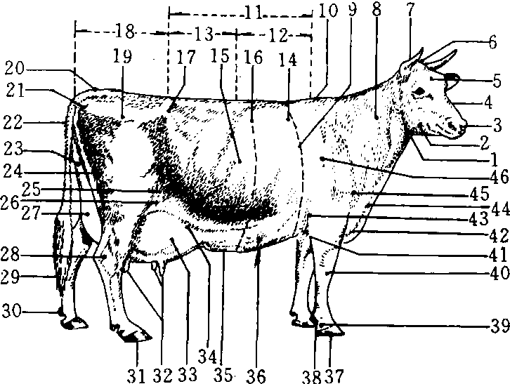 乳用母牛躯体各部位名称 1.喉 2.下颌 3.口笼 4.鼻梁 5.额 6.头顶 7. 角 8.颈 9.胸围 10.鬐甲 11.背部 12.前背 13.腰 14.肩后 15.肋部 16.躯深 17.腰角 18.臀部 19.髋部 20.尾根 21.臀角 22.尾 23.后乳房附着 24.大腿 25.后膝 26.胁 27. 后乳房 28.飞节 29.尾梢 30.悬蹄 31.蹄 32.乳头 33.前乳房 34.前乳房附着 35.乳静脉 36.乳井 37.蹄底 38.踵 39. 系部 40. 膝 41. 胸基 42. 前胸 43. 肘端44. 垂皮 45. 肩端 46. 肩胛骨 |