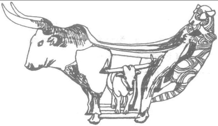 牛虎銅案 牛虎铜案1972年云南江川李家山24号墓出土。青铜制,滇族祭器。器高43、长76厘米,重12.55公斤。案边宽2至3厘米、案横33厘米、纵21厘米。主体为一立牛,牛四足作案足,前后蹄间有横梁相连,牛背作椭圆形盘状,为案面。牛体前倾,另铸一虎扑于牛尾,保持案身平衡。牛腹下横立一牛犊。该案设计巧妙,造型奇异,形象生动传神,从而显示了匠师的丰富想象力和高超的艺术创作水平。 |