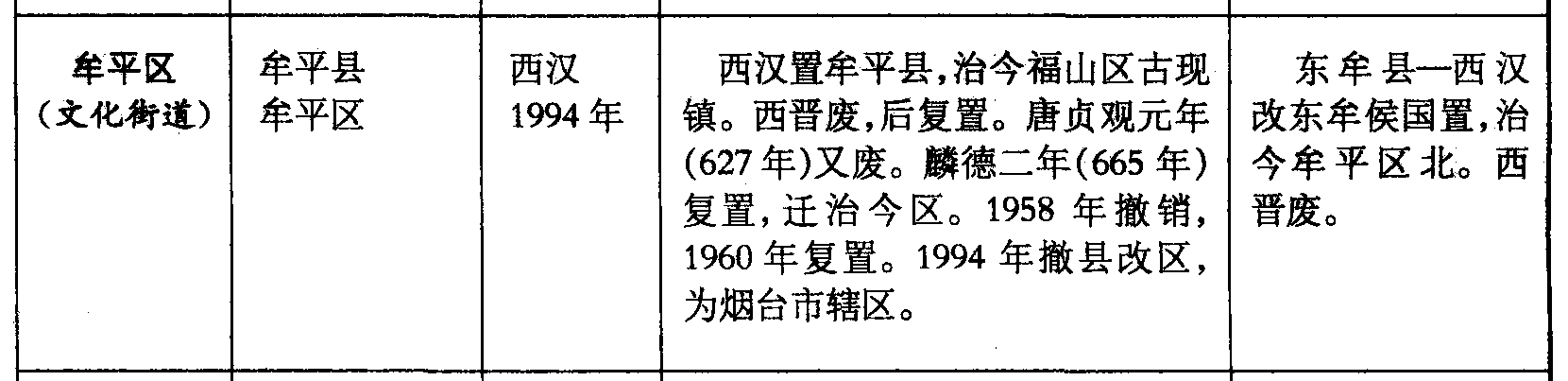 牟平区(文化街道)牟平县牟平区西汉1994年西汉置牟平县,治今福山区古现镇。西晋废,后复置。唐贞观元年(627年)又废。麟德二年(665年)复置,迁治今区。1958年撤销,1960年复置。1994年撤县改区,为烟台市辖区。东牟县—西汉改东牟侯国置,治今牟平区北。西晋废。
