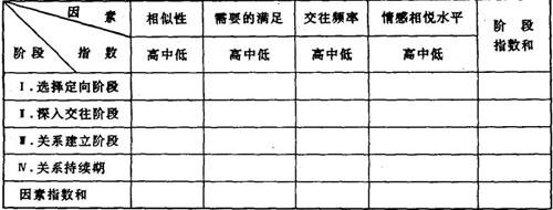 反映人际关系质量和发展情况的数量。 将影响人际关系的诸因素数量化,作为衡量人际关系质量的变量;再结合人际关系建立与发展的不同阶段,可绘制一张评价某一具体人际关系的现状和历史发展的"人际关系指数表"。该表包括下列几种人际关系指数: ❶ 因素指数,即每一影响人际关系因素的相应指数。如"情感相悦水平"因素指数反映人际关系某一点的情况:"-1"二低,"+1"二高。因素指数和,即人际关系发展的各个阶段的同一因素指数之和。 因素指数和反映在整个人际关系发展过程中,某一影响人际关系因素的性质和程度。 ❷ 阶段指数和,即在某一阶段人际关系各个因素指数的和。 反映人际关系发展的某一阶段上彼此相互吸引的性质和水平,亦即说阶段人际关系的质量如何。 ❸ 总指数,指各个因素指数和相加或各个阶段指数和相加所得的指数,从整体上反映人际关系的质量。 表中,从左到右排列的是影响人际关系的诸因素。对于其中的每一因素都根据其实际存在的三种可能性规定了相应的指数:-1、0、+1。从上到下排列的是人际关系发展的四个阶段。根据被测量对象的情况,参照各因素的指数标准,在表中填入相应指数,即形成衡量人际关系质量和发展情况的人际关系指数系数。 人际关系指数表