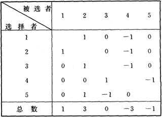 也称“社会矩阵”。 是显示团体内人际关系结构及各成员人际关系状况的直观形式之一,用于社会测量结果的整理与分析。在运用社会测量法收集到社会测量数据后,研究者可以把被试及其选择列为n×n(n为被试数)的矩阵表,此即人际关系矩阵(见附表)。 由人际关系矩阵表可以看出团体中各成员的选择情况,并可以统计各成员被选择数,由此揭示各成员人际地位。例如,从下表中可以看出1号与2号被试相互喜欢,2号被试是明星,而4号被试被排斥。如果出现矩阵表整理后不能区分成员间差异的情况,则可进一步运用矩阵分析。矩阵分析是将矩阵表中原始矩阵,根据各个成员得分情况转移行列,使每一对行与列的顺序一致,然后通过运算揭示成员人际关系地位及团体内人际结构。 其运算复杂,通常借助电子计算机完成。如果需要更详细地分析团体内部人际结构,还可以针对各种选择形态列出统计分表,例如小团体分表、互选数分表等,并可以此为基础运用矩阵分析。 一般而言,人际关系矩阵及以其为基础的矩阵分析主要适于小团体社会测量。 小组人际关系矩阵  (注:1——最喜欢;0——无意见;-1——最不喜欢) |