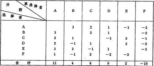 美国社会心理学家莫雷诺等人用来整理人际关系测量结果的一种形式,即根据团体总人数n而制成的nxn的排列表。 表内记入成员间的选择关系或排斥关系。这种关系可用分数表示,如最喜欢的给3分,其次的给2分,再次的给1分;同样,最不喜欢的给-3分,以下依次给-2分、-1分。 将分数填入参见下表:  表内,就可以从数字上一目了然地知道团体内人际关系。 统计每人的得分,若某人正的分数越多则表示他在团体中越受人欢迎,如某人负的分数越多则反映他越不受欢迎。通过图表还可以了解团体内的人际关系结构,如谁选择谁,选择是单向还是双向的,谁被他人选择最多等。 上表数字表明,A最受欢迎,F最不受欢迎。这种矩阵可以根据不同项目一一列表,最后还可以把各表加以综合,以反映每个人的总好恶关系和受欢迎程度。 |