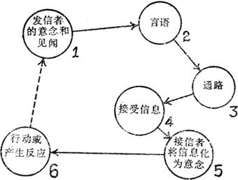 人际沟通时意见交流的基本程序,为传信者将意思或所见的事化为言词,随后经信息通道进行消息传送,受信者将接受传送来的信息化为意思,并采取行动或产生反应。这个程序示如图2。