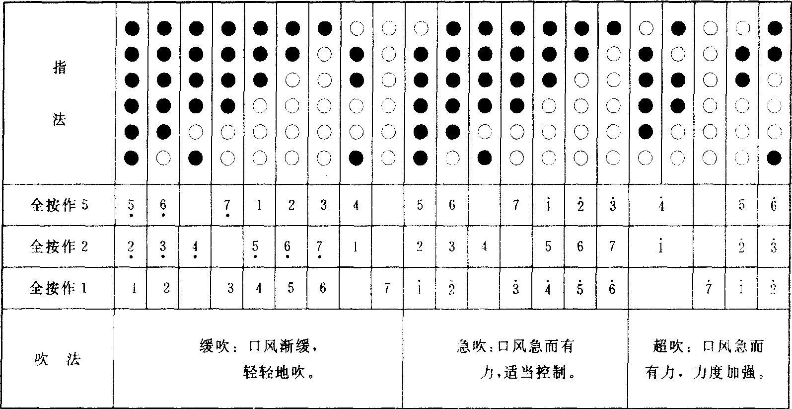 表示送音,在主音将完时腹部略一震动,送音孔位手指放开,气息一断,出现短促的余音效果)、全按作2的指法及练习、全按作1的指法及练习。
