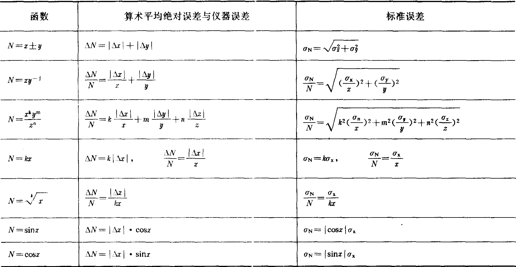 在实际实验当中,物理测量值存在两种情况:直接测量值和间接测量值。前者为可用仪器直接读取数据的测量值,后者为由直接测量值经过物理规律和数学演变而求出的测量值。直接测量值可通过单次测量或多次测量两种方法获得。由于单次测量无法计算其偶然误差,所以应注意不能滥用单次测量。一般在下列情况下允许进行单次测量:客观上只能进行单次测量,例如观察彗星;系统误差显著大于偶然误差,例如因仪器的粗糙,其多次测量值完全不能显示出差异;计算间接测量值时,若各直接测量值的系数相比较,某一项系数比另一项低两个以上的数量级,则与该项系数相乘的直接测量值可考虑单次测量。单次测量时若无已知理论值或其它高精确度测量值,可认为该单次测量值为真值替代值,仪器的极限误差为绝对误差。多次测量得出的直接测量值一般取其算术平均值做真值替代值,其绝对误差可取E仪与 x或σ之一的和。间接测量值N的误差可用误差传递公式求出。若N=f(x、y、z),可用f( 、 、 )做真值替代值。 上表给出中学物理常用的函数误差传递公式。表中的 x、 y、 z;σx、σy、σz分别为直接测量值x、y、z的算术平均误差和标准误差。读取直接测量数据时,确定其最末有效数位的基本原则是读到仪器极限误差出现的首位。对标有精度等级的仪器(如电表),其各档的极限误差△x仪是不同的:设标称精度等级为k,则△x仪=k%·xm,式中xm为某档的最大量程。没有标明精度等级的仪器,△x仪通常读最小刻度的0.5个单位。例如,2.5级电压表25伏档,其△x仪=2.5%×25=0.625伏;毫米尺的最小刻度0.5毫米,△x仪=0.25毫米;从这两件仪器上读数时都精确到0.1。 ☚ 物理实验技能 误差分析方法 ☛ |