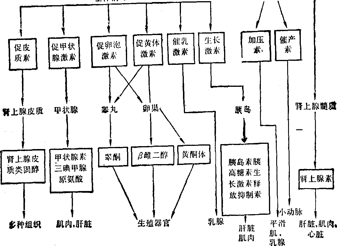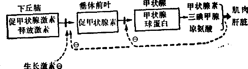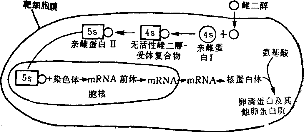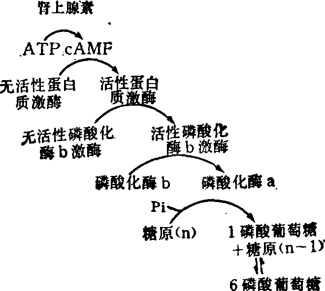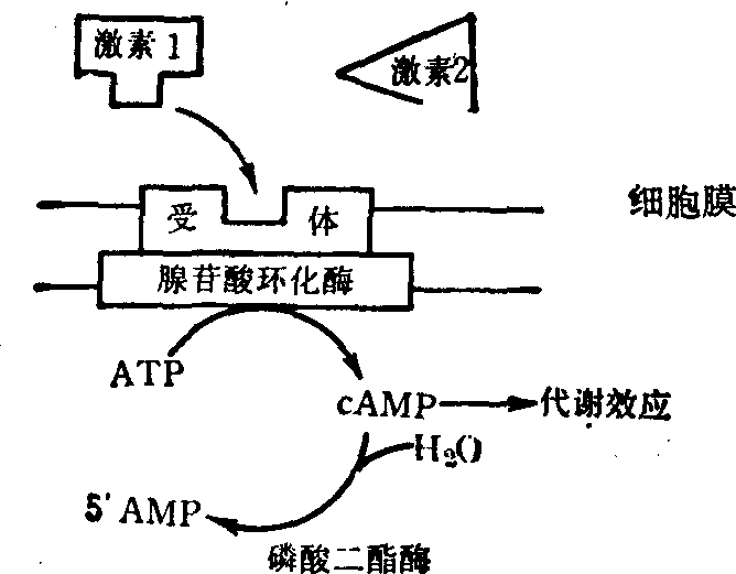 ![]() 图1 调节体系示意图 纵上所述,可见机体总是通过神经体液来调节体内的物质代谢,以应付所遭遇的异常情况。 物质代谢在细胞水平的调节 (1) 作用于细胞的调节体系: 体内的物质代谢是受机体所在环境的影响。外来的刺激因素首先影响神经,然后传导到内分泌腺,以分泌激素,经血流而达到各种组织细胞并调节其物质代谢。激素是调节细胞中代谢的物质。各种激素虽然与全身的细胞都有接触,但只对其靶组织中的靶细胞起作用。现将这种调节体系中较重要者用图表示,其各环节间的关系如上图: ![]() 图2 反馈抑制示例Ө代表抑制 激素的调节也受反馈抑制的控制,例如下丘脑可分泌促甲状腺激素释放激素,促垂体前叶释放促甲状腺激素,以促进甲状腺合成甲状腺球蛋白,作为合成甲状腺素及可以抑制垂体前叶释放促甲状腺激素,也可以抑制下丘脑分泌促甲状腺激素释放激素。此外下丘脑及胰脏分泌的生长激素释放抑制素也抑制促甲状腺激素释放激素的分泌。这一反馈抑制的例子可图示如上页: (2) 激素的受体: 激素具有高度特异性,只作用于靶细胞,这就意味着靶细胞必定拥有使激素能识别的特殊结构; 这种结构就是激素的受体。激素的受体有的是在细胞的表面上,也有的是在胞液中,在细胞表面者为水溶性的肽及胺类激素的受体,而存在于胞液者则是易于通过质膜的脂溶性类固醇类激素的受体。它们可能都是一些特定的糖蛋白,对于激素分子都具有高度的特异性及亲和力。一种激素能选择性地识别其特定的受体,并与其结合成复合物。这种复合物即会导致“第二信使”的生成或释放。第二信使将激素与受体的复合物所携带的信息传递给特定的酶或分子体系,使激素所负的使命得以实现,这就是细胞内的第二信使调节特定酶促反应或使特定基因能够表达。 ![]() (3) 环磷酸腺苷的作用: 在许多情况下,第二信使实际即是环3′,5′-磷酸腺苷,简写为cAMP,其生成过程可图示如下: 图3 cAMP的生成和水解 cAMP如何触发特定酶促反应的问题,可用糖原生成对糖原分解的作用来说明。在肌肉活动中肾上腺素与细胞膜上的受体结合而激发cAMP的生成;而cAMP当即触发糖原分解的级联反应(图4),同时抑制糖原的生成。当肌肉活动减少时,磷酸己糖因无需用以生产ATP而累积,即会反过来将糖原合成酶b激活为糖原合成酶a,以促进糖原的生成,同时抑制磷酸化酶b转变为磷酸化酶a。 cAMP也可影响胞核,其作用是通过激活特定蛋白质激酶,促使非组蛋白磷酸化而从与DNA的结合部位上脱落下来,从而使被阻遏的基因得以表达。 ![]() 图4 糖原分解的级联反应 (4)性激素对靶细胞的作用: 雌激素及雄激素均为脂溶性类固醇物质,能透过质膜而进入细胞; 其受体存在于胞液中,且不以cAMP为第二信使。例如,雌二醇在进入子宫及乳腺的靶细胞后,在胞液中与一特定4s的蛋白质(即受体)结合,经转变成5s的化合物(即第二信使)后而进入胞核,并作用于染色体而促进mRNA的生成,以合成特定的蛋白质。这一过程可用雌二醇对鸡输卵管靶细胞的作用来说明: 睾酮也有类似的作用,但必须先转变成二氢睾酮后,才能与其特定蛋白质结合。 图5 雌二醇的作用机理示意图 亲雌蛋白I(estrophilin I)为雌激素受体; 亲雌蛋白II(estrophilin II)为活性雌二醇受体复合物 物质代谢在分子水平的调节 物质代谢中的各个化学反应主要由酶促成,所以酶分子的结构改变及合成、降解速度的增减乃是调节代谢最直接的因素。酶分子结构改变甚为快速,其发生以分秒计。而合成及降解则较为缓慢,需数小时才能实现。结构的改变包括分子的变构及修饰,与机体的需要及内环境有较大关系,至于合成及降解,尤其是合成则涉及基因的作用。 (1) 通过酶分子变构的调节: 一个代谢途径的发生或消失及进行速度的增减,取决于其调节酶的活性。而酶的活性,在温度、pH、作用物及辅助因子等恒定的情况下,又取决于其分子的结构。调节酶具有变构的性质,故常称为变构酶。变构酶往往位于代谢途径的开端处或其附近,其所促进的多为一重要而不可逆的反应,其分子结构可为一些激动或抑制效应分子所改变。变构酶的分子具有一些特定的结构部位,可与某些小分子结合,如与作用物、终末产物、代谢中间产物或甚至其它代谢途径的产物结合; 一经结合,酶分子的构象即会发生改变而影响其活性; 结合不同的分子,产生不同的结果。在分解代谢中,例如在糖酵解中,ATP是磷酸果糖激酶的作用物,也是其变构调节剂。当体内需要进行糖酵解以供给能量时,ATP与磷酸果糖激酶结合而促进酵解的进行,但在ATP水平升高到超过需要时,它又有抑制磷酸果糖激酶的作用,从而使酵解减慢或停止。柠檬酸盐也是磷酸果糖激酶的抑制剂,有降低酵解速度的作用。 变构酶可与多种小分子物质结合,但与代谢途径的终末产物结合是其特有的性质。当终末产物超过需要时,即与酶分子结合而改变其构象,因而抑制其活性; 这就是反馈抑制。变构反馈抑制的例子很多,其最早发现者为细菌中促进L苏氨酸转变为L异亮氨酸的酶体系。这一体系由五种酶组成,以苏氨酸脱水酶为这一转变开端的酶。苏氨酸脱水酶可被转变过程的终末产物,异亮氨酸所抑制; 这当然是异亮氨酸生成过多时发生。异亮氨酸是苏氨酸脱水酶的特异抑制剂,并不抑制体系中其它酶,同时其它的中间产物对苏氨酸脱水酶也无抑制