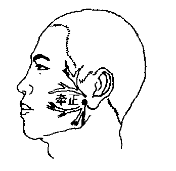 牵正经外奇穴名。位于耳垂前0.5~1寸。在咬肌中。正当面神经颊支,上前方有腮管; 深部有咬肌动、静脉分支。主治面神经麻痹,腮腺炎,口腔溃疡等。斜刺或沿皮刺0.5~1寸 (图100)。