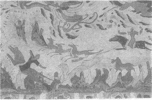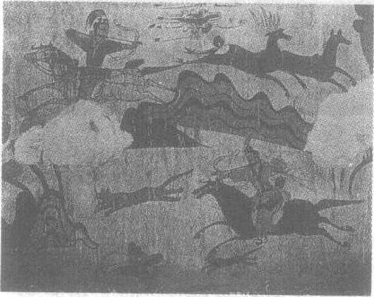 释义 | 狩猎图壁画 狩猎图壁画高句丽(公元4世纪)。纵110厘米,横135厘米。吉林省集安县舞踊墓墓室西壁左侧壁画。此图以绵延的山峦为界,分上下两层,上层一位冠插羽毛、着红襦黄裤的猎人骑在奔驰的马上,他侧身回首,上箭拉弓,欲射一对奔鹿。下层的两位骑手装束与前一位猎人类似,一位腰挎箭囊,拉弓瞄准前方一只飞跑的猛虎,马旁一只猎犬,狂叫着奔向猎物。画面的右下侧也有一位猎手在拉弓。此图场面紧凑,富有生气,射猎时紧张的气氛通过马、鹿、虎、猎狗足不沾地的狂奔得到渲染。猎手们心神镇定,姿态潇洒矫健,表现出他们的勇敢强悍。此图笔法有力,设色深沉,其艺术与远在万里之外的敦煌莫高窟第249窟西魏狩猎图相类似,由此可见魏晋时期艺术传播之广。 ☚ 角牴图壁画 歌舞图壁画 ☛ 狩猎图壁画 狩猎图壁画西魏。甘肃省敦煌县莫高窟第249窟窟顶北披壁画。此为北披所绘图案的局部。山峦之间正在进行扣人心弦的狩猎活动,一穿交领黑衫的猎手骑在马上,骏马扬起前蹄,猎手回首张弓,目标为身后的一只老虎。猛虎在生死关头为求得生存作最后一搏,它四肢腾空,挺身引颈,张开大口,向猎手扑去。情节生动,令人似闻马蹄声声和猛虎长啸的回响。画面的上方还有一穿红衣的猎手,他手持镖枪,在追逐一群黄羊,黄羊惊恐地急促奔跑。画面色彩鲜艳,将狩猎的激烈场景烘托得十分醒目。其中黄羊和猛虎的形象绘得最为生动。黄羊被厚重的土红色彩填涂,身姿矫健轻盈,肢体细长而夸张,充分显示了这种灵巧而擅长奔跑的动物的特性。图中的猛虎身体虽未重色填塗,但土红色简单而灵活的数笔白描勾勒,将它刻画得栩栩如生。 ☚ 羽人升腾图壁画 野猪觅食图壁画 ☛ |