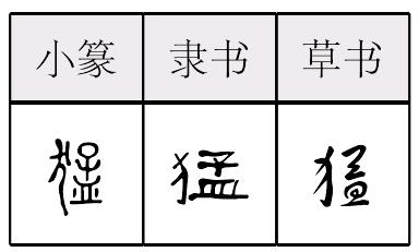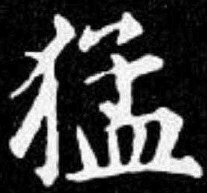 猛měng古代名物 > 獸畜類 > 畜部 > 犬科 > 猛 猛 měng 謂健犬。亦泛指健壯。《說文·犬部》:“猛,健犬也。从犬,孟聲。”《廣雅·釋詁》:“猛,健也。”唐·杜甫《朝獻太清宫賦》:“張猛馬,出騰虯。”參本類“猛犬”。 猛měng〖形容词〗 一、勇猛,凶猛(6)。《报任安书》:猛虎在深山,百兽震恐。——凶猛的老虎在深山里,各种野兽都震惊恐惧。《李陵答苏武书》:猛将如云,谋臣如雨。——勇猛的将领像云一样,足智多谋的大臣像雨一样。《石钟山记》:如猛兽奇鬼。——像凶猛的野兽、奇怪的鬼魅。 二、严厉(7)。《子产论政宽猛》:不忍猛而宽。——不忍心用严厉的政策而用宽大的政策。《子产论政宽猛》:慢则纠之以猛。——轻慢了就用严厉来纠正。《子产论政宽猛》:宽以济猛,猛以济宽。——宽大用以调剂严厉,严厉用以调剂宽大。 猛měng❶ 凶猛。《礼记·檀弓下》:“夫子曰:‘小子识之,苛政~于虎也。’”(识zhì:记住。)苏轼《石钟山记》:“大石侧立千尺,如~兽奇鬼,森然欲搏人。” ❷ 勇猛。《荀子·不苟》:“刚强~毅,靡所不信,非骄暴也。”《赤壁之战》:“今将军诚能命~将统兵数万,与豫州协规同力,破操军必矣。” ❸ 猛烈。吴均《与朱元思书》:“急湍甚箭,~浪若奔。”《赤壁之战》:“火烈风~,船往如箭,烧尽北船,延及岸上营落。” ❹ 严厉。《左传·昭公二十年》:“宽以济~,~以济宽。” ❺ 突然。王实甫《西厢记》第一本第三折:“~听得角门儿呀的一声,风过处花香细生。”《水浒传》第四十七回:“宋江~省道:‘我的不是了。’” 猛*měngC3CD ❶力量大,气势强劲:勇~/~虎/~烈。 ❷凶暴:~禽/苛政~于虎。 ❸忽然,突然:~然惊醒/突飞~进。 凶猛 凶猛猛(猛利;猛悍;骏猛;狰猛) 鸷(鸷勇;鸷猛;狠鸷;猛鸷) 狞(狞猛;狰狞;生狞) 凶勇 恶躁猜鸷 猜狂 悍暴 猖獗 熊虎 凶猛不羁:豪鸷 凶猛而势盛:凶锐 凶猛而傲慢:鸷骜 迅急而凶猛:迅悍 强悍凶猛:悍犷 骄纵凶猛:骄狞 骄横凶猛:骄猛 粗鲁凶猛:粗猛 残暴凶猛:残猛 狰狞凶猛:矜牙舞爪 (凶恶而强有力:凶猛)