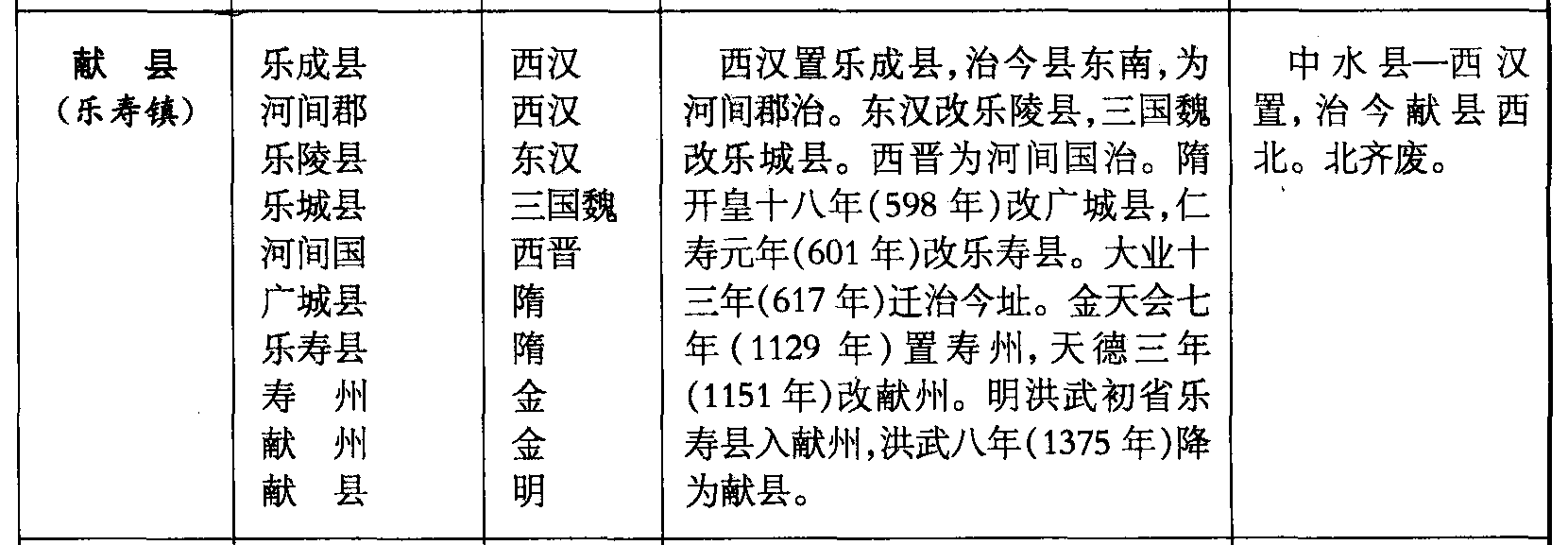 献县(乐寿镇)乐成县河间郡乐陵县乐城县河间国广城县乐寿县寿州献州献县西汉西汉东汉三国魏西晋隋隋金金明西汉置乐成县,治今县东南,为河间郡治。东汉改乐陵县,三国魏改乐城县。西晋为河间国治。隋开皇十八年(598年)改广城县,仁寿元年(601年)改乐寿县。大业十三年(617年)迁治今址。金天会七年(1129年)置寿州,天德三年(1151年)改献州。明洪武初省乐寿县入献州,洪武八年(1375年)降为献县。中水县—西汉置,治今献县西北。北齐废。
