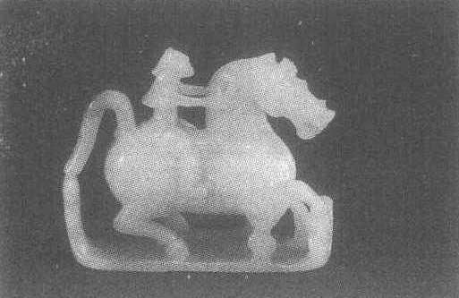 释义 | 古代名物 > 雕繪類 > 雕塑部 > 工藝雕塑 > 玉仙人奔馬 玉仙人奔馬 yùxiānrénbēnmǎ 西漢玉石雕刻。公元1966年陝西省咸陽市漢昭帝平陵遺址出土。圓雕。高七厘米,長八·九厘米。玉料呈白色。奔馬昂首挺胸,張口露齒作嘶鳴狀。雙目前視,兩耳竪立。四肢彎曲,右前蹄蹬空,脚踏雲板,身飾羽翼,作飛騰狀。馬背上騎一仙人,頭繫方巾,身着短衣,威武異常。玉馬肢體肥碩,雕琢精美,表現了西漢玉雕工藝之卓越水平。是迄今所知之絕世佳品。現藏陝西省咸陽市博物館。 玉仙人奔马 玉仙人奔马西汉早期。高7厘米,长8.9厘米。1966年陕西省咸阳市汉昭平陵遗址出土。陕西省咸阳市博物馆藏。玉料为白色,质地坚硬,温润细腻,圆雕而成。马勾首嘶呜,双耳如锥,鬃毛齐整,身躯极为健壮僄悍,并阴刻翅膀。四肢弯曲。与踏板相连,右前蹄翅起,作奔腾飞跃状。马背上骑一人,头束巾,穿短衣,双腿夹紧马肚,两臂前伸触及马颈,神气活现。此玉雕琢细腻,骏马骨肉停匀,其内在的气质也刻划了出来,是汉代玉雕精品。有人从此马的神态判断,玉雕表现的是“天马”。《汉书·张骞传》:“‘神马当从西北来’。得乌孙马好,名曰 ‘天马’。”古代诗人对西域来的骏马(即天马)也曾有极为生动细致的歌咏。 ☚ 玉鹰 玉辟邪 ☛ 玉仙人奔马 玉仙人奔马yuxianren benma西汉玉雕。1966年咸阳市周陵公社(今咸阳市渭城区周陵镇)新庄村附近出土。通长8.9厘米,高7厘米。立体圆雕。白玉质,色泽宛若羊脂,温润莹亮。玉雕整体由奔马、仙人和底座组成。马高大健壮,两肋阴刻羽翅,躯体前倾,长尾高扬,四蹄前蹬,作腾云驾雾状。仙人纶巾束首,身着羽衣,昂首挺胸,双手抓马鬃,两腿贴马腹。马蹄下底座上线雕出相互缠绕的祥云,马前肢和马尾皆有云柱与底座相接。天马羽人似在仙境中遨游,表达了汉代人羽化登仙、长生不死的思想。现藏咸阳博物馆。 ☚ 玉龙佩 玉鱼 ☛ |