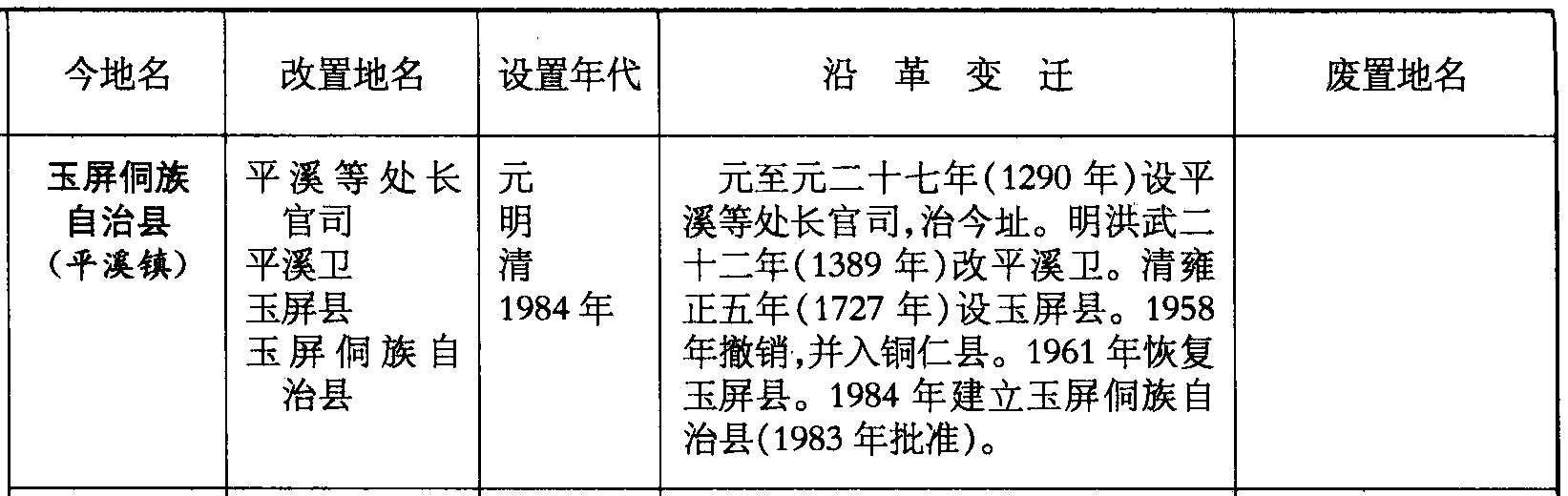 玉屏侗族自治县(平溪镇)平溪等处长官司平溪卫玉屏县玉屏侗族自治县元明清1984年元至元二十七年(1290年)设平溪等处长官司,治今址。明洪武二十二年(1389年)改平溪卫。清雍正五年(1727年)设玉屏县。1958年撤销,并入铜仁县。1961年恢复玉屏县。1984年建立玉屏侗族自治县(1983年批准)。