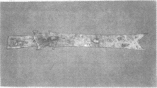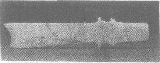 商。长38厘米。1986年四川省广汉三星堆1号祭坑出土。四川省文物管理委员会藏。玉质为乳白色,一侧边为黑灰色。器身两侧呈弧形,两面各刻一璋形图案。器身与柄之间有阴刻平行线纹、齿状扉棱及一圆穿。射部镂刻一卧鸟。“璋”又称为“戚”,最早见于龙山文化遗址中,是一种武器。玉璋则是一种礼器,四川地区商周遗址多有出土,而以此最精。