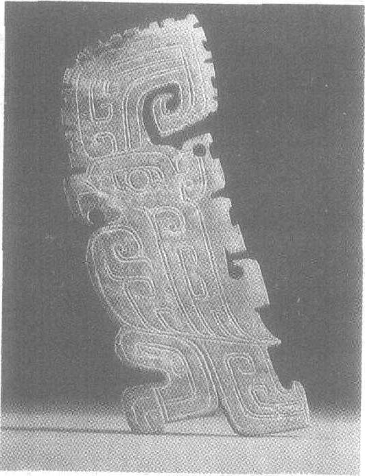 商。高11厘米,厚0.3厘米。河南省安阳市殷墟妇好墓出土。北京中国社会科学院考古研究所藏。玉质呈浅绿色,上有褐斑。鹦鹉体扁平,呈挺身站立状,钩喙尖细,臣字形目,腹圆鼓,足上雕四爪,长尾外撇而下垂。头上有以单阴线和双钩饰纹的高冠,冠边缘有锯齿状突起。足下有榫可供插嵌。突出的高冠、尖喙和长尾使整个形象富有装饰情趣。淡绿的色调则使人联想到鹦鹉美丽的羽毛。妇好墓出土的鹦鹉共21件,以扁体浮雕为主,看似形制相像,但细部均有变化而不雷同。鹦鹉是一种美丽而乖巧的鸟,墓中出土玉鹦鹉数量如此之多,也反映出当时人们对它的喜爱。殷墟妇好墓见“殷墟妇好墓”条目。