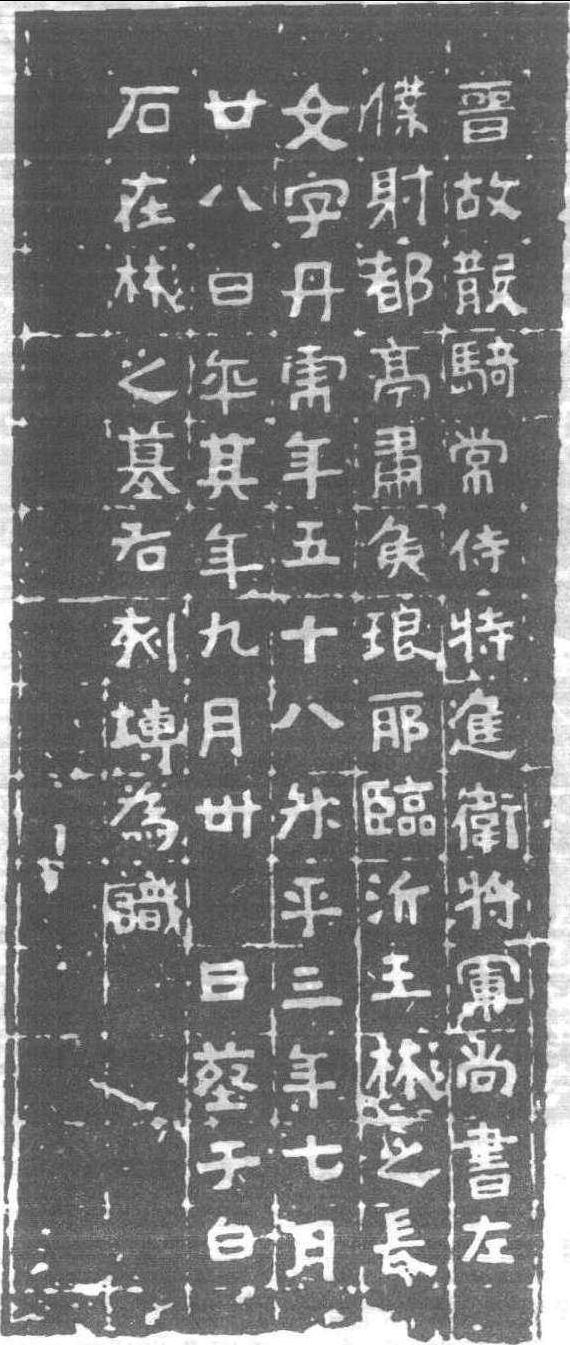 東晉·升平三年 (359) 刻。王丹虎乃王彬 (王羲之叔父)長女,興之姊。是志于一九六五年一月出土南京新民門外象臺山,為一長方磚志,長四十八公分。楷書五行,行十四字。字體為楷,風格特出,與 <王興之墓志>、<王興之妻宋氏墓志>、<王閩之墓志> 屬同筆。此書風出于同時同地,試為研究課题。→見【王興之墓志】
