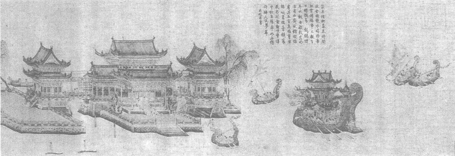 释义 | 王振鹏龙舟竞渡图卷 王振鹏龙舟竞渡图卷元。王振鹏绘。绢本墨笔。纵25厘米,横114.6厘米。北京故宫博物院藏。王振鹏,字明梅。永嘉(今浙江温州)人。约生活于元仁宗时代。官至漕运千户,擅墨笔界画,工致细密,神气飞动,不为法拘,被誉为“元季界画可为第一”。亦擅人物,作品多以宫廷、贵族生活为题材,曾因画艺得元仁宗赏识而赐号“孤云处士”。此图描绘北宋汴京后廷金明池三月三日闹龙舟的情景。画面只表现了金明池的中部一段,石栏雕砌,岸柳依依,拱桥伸入池中,石台浮出水面。楼阁高耸,殿宇危峙。柱廊回音,飞檐生风。密密层层,极尽精丽工巧之势。一只巨大的楼船悠然徜徉于池水之中,周围簇拥着龙舟小艇,旗幡招展。拱桥下正在举行激烈的夺标船赛。每条船的船头都有一人立身指挥,众赛手长桨齐举,动作统一。一驾龙舟已接近阵门,准备作最后冲刺。画面中人影攒动,气氛热烈,与严整规矩的建筑背景形成了强烈的动静对比。此图笔法纤细,毫芒毕现,场景宏大,繁简得宜。无作者款印。经鉴定为王振鹏旧稿。此图曾经清内府收藏,《石渠宝笈》著录。 ☚ 商琦春山图卷 王振鹏伯牙鼓琴图卷 ☛ |