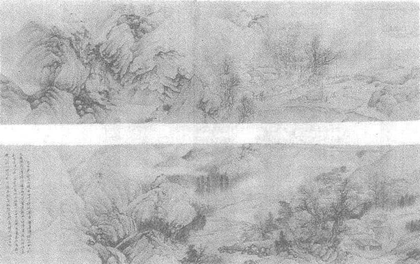 清。王概绘。绢本设色。纵29厘米,横918.1厘米。上海博物馆藏。王概(公元1654—约1710年),初名丐,后改今名,字安节,原籍秀水(今浙江嘉兴)人,居金陵(今江苏南京),善画山水、人物和花鸟。山水学龚贤,以苍健、雄快取胜。著有《画学浅说》、《山飞泉立草堂集》。据此作品的跋可知,画卷是作者沿长江北上40余日后,经反复思考,并借宋人诗意绘制而成。图中所绘为南京郊区的乡野景色。在构图上高远、平远二法兼具,使观者立足点高,视野开阔。作者以细致入微的笔触表现了江南明媚灵秀的山峦、跌宕湍急的溪水、悬如白练的飞瀑、浩淼广阔的大江、阡陌交错的田畴、宽敞整洁的院落。在山水之间活动的人物和舟船,为此画增添了生命力。载客的帆船已升帆起航,渔舟泊于渔浦待发,有人站立院中观景,有人对坐于室中叙谈。整个画面具有遥深恬静的气氛,使观者在如诗的景色中眺望远帆而勾起淡淡的哀愁。作者在用笔时以小斧劈皴和麻皴表现山石的浑厚,用细秀柔韧的线条表现垂柳的风姿及被霜染红的杂树,既显示出秋天的特色,又起到点缀画面的作用。作品款署“绣水王概”,钤<王概之印>朱白文印。