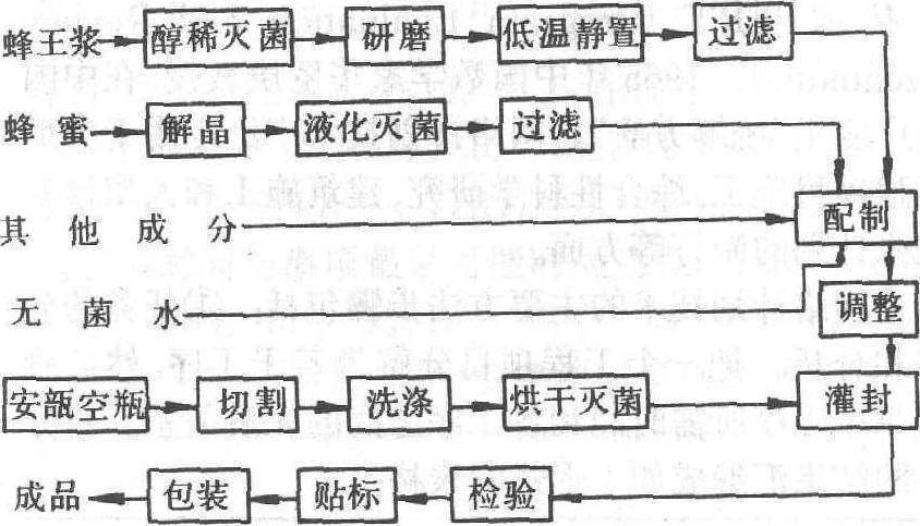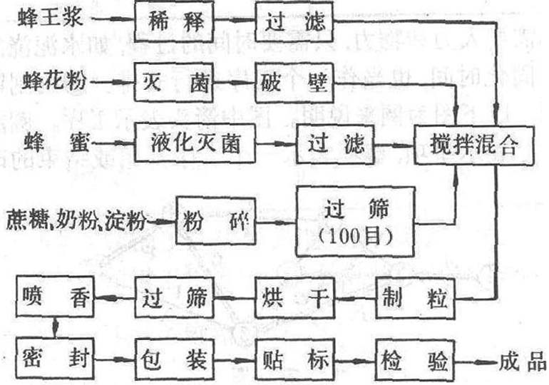 释义 | 王浆加工bee royal jelly processing蜂王浆又称蜂乳,是工蜂头部两侧营养腺所分泌的一种粘稠状乳汁。新鲜王浆呈乳白色或淡黄色,略带香甜和酸涩、辛辣的气味。王浆中含有多种氨基酸、维生素、矿物质、酶和激素等生物活性物质。王浆中的10-羟基-2-癸烯酸对多种细菌和真菌都有抑菌作用。王浆可经初加工制成鲜王浆,或经冷冻干燥制成冻干粉出售。王浆也是制成多种营养保健品的原料。 王浆冻干粉加工工艺流程图 蜂王浆口服液,以新鲜蜂王浆辅以蜂蜜等营养成分加工而成。可以较好地保持王浆的有效成分,调整了产品的色、香、味,提高了使用价值和商品价值。其加工工艺流程为: 蜂王浆花粉晶,是以蜂王浆、蜂花粉和蜂蜜为主要原料配制而成,是一种高级营养冲剂。其加工工艺过程如下: 王浆片剂和胶囊,均采用王浆冻干粉,再辅以淀粉或葡萄糖等成分制成。王浆片剂每片含鲜王浆70毫克;王浆胶囊每粒含鲜王浆50~100毫克。 |