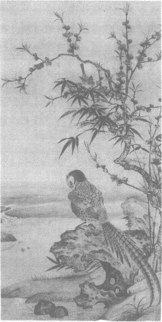 元。王渊(见《王渊竹石集禽图轴》条目)绘。纸本墨笔。纵102.3厘米,横55.4厘米。北京故宫博物院藏。图中一道清流婉转坡前,泛起阵阵涟漪,岸草青青,秀石挺立,石上一只色彩斑斓的锦鸡侧头转颈,正在啄理肩头的羽毛,雌鸡立在石后回头返望。石旁细竹轻挺,枝叶疏秀,桃树枝干折转,花蕾初绽。一只山雀躲在枝头,拍着双翅,仰头鸣叫。远处,雾色朦胧,一片幽寂。此图用笔工细谨严,勾染结合。作者以浓淡不同的墨色描绘物象的质感:柔细的鸟羽、温厚的坡土、坚重的湖石、瘦硬的桃竹,以及鲜润的花萼、细嫩的新叶都表现得恰到好处。鸟雀神态自然生动,花木竹石淡雅清秀,既有黄(荃)家花鸟富丽端庄的气质,又有文人画疏淡雅洁的风格。画幅左下方款署:“至正己丑王若水为惠民作山桃锦鸡图。”下钤〈澹轩〉、〈王若水〉二印。至正己丑为公元1349年。图中并钤有〈子孙永保〉、〈海滨程氏〉等收藏印。