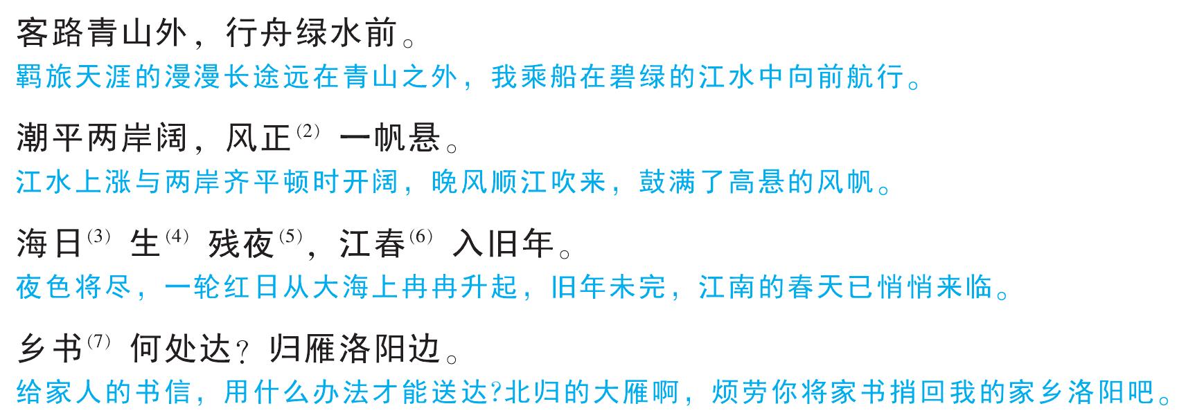 客路青山外, 行舟绿水前。 潮平两岸阔, 风正 (2)一帆悬。 海日(3)生(4)残夜(5), 江春(6)入旧年。 乡书(7)何处达? 归雁洛阳边。