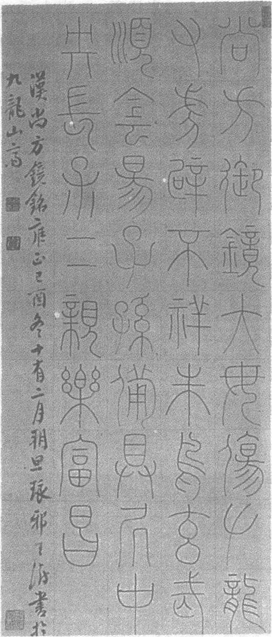 清。纸本。纵94.8厘米,横40.5厘米。上海博物馆藏。王澍(见《王澍行草书临古法帖》条目)书。此篆书:“尚方御镜大毋伤,左龙右虎辟不详,朱鸟玄武顺阴阳,子孙备具居中央,长保二亲乐富昌。”款署“汉尚方镜铭。雍正己酉冬十有二月朔旦,琅邪王澍书于九龙山斋。”款下钤白文〈天官大夫〉、〈澍〉印。起首钤白文〈随园〉长方印。此幅篆书结字匀称规正端庄,笔画纤细,用笔圆润,盘屈缭绕,柔和婉转,由此可以看出王澍凝重醇古的艺术书法个性。