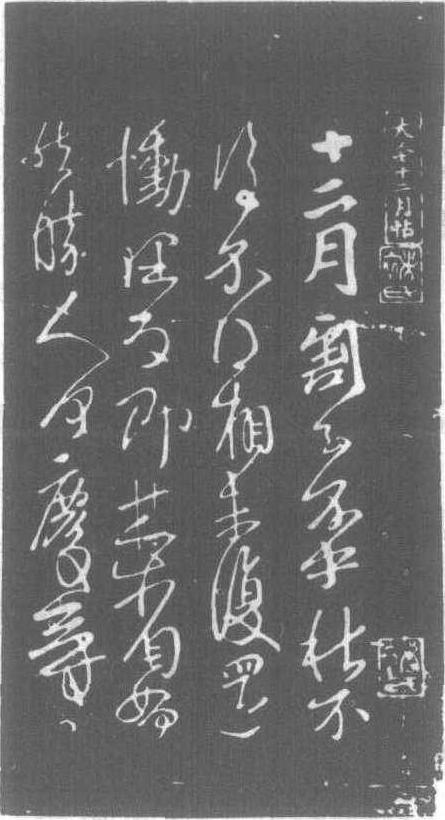 释义 | 王献之十二月帖 王献之十二月帖为王献之草书的代表作。该帖由开始行楷书渐变为行草书,字多联属,笔势奔放,可见王献之善一笔书之长。帖中写的内容为:“十二月割至不中秋不复不得相未复还恸理反即甚如何然胜人何庆等大军。”原墨迹曾为宋代米芾所收藏,此帖宋代曹之格刻入《宝晋斋法帖》第一卷中。对唐代草书家张旭、怀素等人影响深远。 王献之十二月帖 ☚ 释怀仁集王圣教序 智永真草千字文 ☛ |