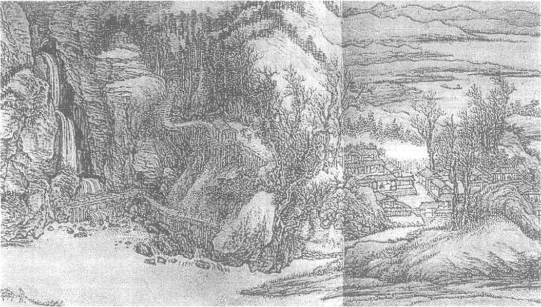 释义 | 王翚《云山竞秀图》 王翚《云山竞秀图》纸本,设色。纵36.5厘米,横438.5厘米。现藏天津市艺术博物馆。此画层峦叠障,山水映带,山间有寺庙、山村、栈道,云烟缭绕,山路之上有赶驴驮货者、牧童骑水牛者、骑驴过栈道者、河边待渡者; 水中有垂钓者、捕鱼者、乘渡船者。山石以斧劈皴间雨点皴,皴染结合,笔路清晰。浅绛设色,景物繁复。气氛宏伟。 王翚 《云山竞秀图》 王翚(1632——1717),字石谷,号耕烟散人、乌目山人,清晖主人等。江苏常熟人。他学古而不囿于古,将南北二体融为一炉,自云: “以元人笔墨,运宋人丘壑,而泽以唐人气韵,乃为大成。”在当时流派纷争颇为激烈的情况下,他不为流派偏见所惑,汲取两派之长,形成个人风格。作品面貌丰富,有的笔法清秀潇洒,景物布置灵便;有的构图饱满,意境空阔。其设色,有的似王蒙,有的类李成。四王使南画笔墨臻于成熟,而光大于王石谷。 ☚ 龚贤《木叶丹黄图》 弘仁《天都峰图》 ☛ |