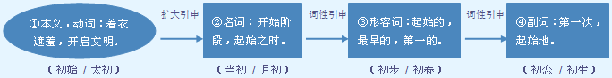 释义 | ![]() 形 开始的;开始的部分。 【例句】唐玄宗开元~励精图治,很快现出兴盛的气象。 【反义】末 【例句】春秋~战国初,我国冶铁业发展迅速。 开始;原来: 年~|~步|~夏|~秋|和好如~。 始 shǐ ★ “初”表示开始,可组合成“初步、初创、初稿、初衷、初战告捷”等。“始”表示起头,与“终”相对,可组合成“始祖、自始至终、周而复始”等。 开始的;第一次: ~创|~始|悔不当~|~露锋芒|教学改革将从下学期~开始。 终 zhōng 年~|始~如一|期~考试|他临~把后事都安排好了。 末 mò ~年|岁~|六十年代~|本公司诞生于上个世纪~|清季的意思就是清~。 第一次;刚开始。修饰单音节词作状语。 ~出茅庐|他们~到山区,什么都不习惯|我~学英语的时候,老是发不好这个音。 常用在“一”至“十”的前面,表示农历一个月前十天的次序。 ~一|~二|三月~八|八月~十。 【词语】 初版 初创 初等 初伏 初稿 初婚 初级中学 初交 初期 初赛 初丧 初诊 初衷 【注意】 “初试”“初婚”“初版”“初级”“初交”“初赛”“初创”“初伏”“初旬”“初等”等词中的“初”,不是前缀。因为同“初试”相对的有“复试”,由此可见,这里的“初”有实在意义,故不能误认为前缀。 字源解说 衣,既是声旁也是形旁,表示服装。初,甲骨文 ![]() ![]() ![]() ![]() ![]() ![]() ![]() ![]() ![]() ![]() ![]() ![]() ![]() ![]() ![]() 附 文言版《説文解字》:初,始也。从刀,从衣。裁衣之始也。 附 白话版《说文解字》:初,起始。字形采用“刀、衣”会义。初,即裁剪衣服的开始。 引申线索 ![]() 【字族索引】 刀 【同音字】 chū |