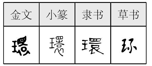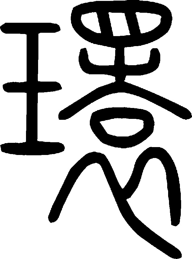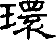 huán環,形声,从王(玉),睘(huán)声,本义为玉环,一种中间有孔的圆形玉器,引申为圆形中空的东西、围绕、包围、许多相互关联牵制的事物中的一个等。清代俗字、《手头字》、《简体字表》、《简化字表》简作“环”,据草书楷化。 【辨析】 环/还/旋 见158页“还”。环 環; 金 篆 隶huán【析形】形声字。古文字形从玉,睘声。从玉,表示玉器。今简化字作“环”,以无义符号“不”代替声符“睘”。 【释义】《说文》:“璧也。肉好若一谓之环。”(肉:边。好:孔。)本义是圆形玉器。引申泛指环形的东西,如耳环。又表示环绕、围绕,包围。又指环节、相互联系的许多事物中的一个。 【shape analysis】It is the pictophonetic character.In ancient character the part玉(yù,jade)is as an ideogram and睘(huán)as phonetic character. 【original meaning】Circular jade. |